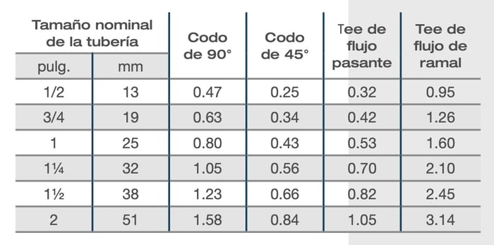 Generalmente se determinan valores de pérdida para cada configuración de conexión por medio de pruebas experimentales, y se expresan en una longitud equivalente de tubería recta (en metros) con valores típicos como los siguientes (para CPVC CTS):